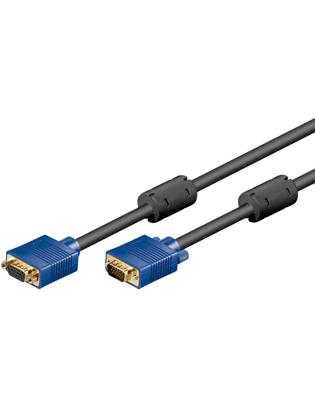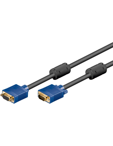 Goobay Full HD SVGA Monitor Extension Cable, gold-plated VGA male (15-pin) > VGA female (15-pin) Designed for high resolution LCD and LED monitors, the VGA cable supports Full HD with 1920 x 1080p and WUXGA (1920 x 1200 pixels) Double-shielded connecting cable with 3 coaxial lines for RGB video signals (individually shielded) as well as 7 control lines Ferrite cores on both cable ends effectively reduce electromagnetic interference Technical specifications Connection, contact material gold-plated Connection, type VGA male (15-pin) Connection 2, type VGA female (15-pin) Cable type round cable Cable length 1.8 m AWG 30 Number of shieldings 2 x Ferrite core yes Color blue, black