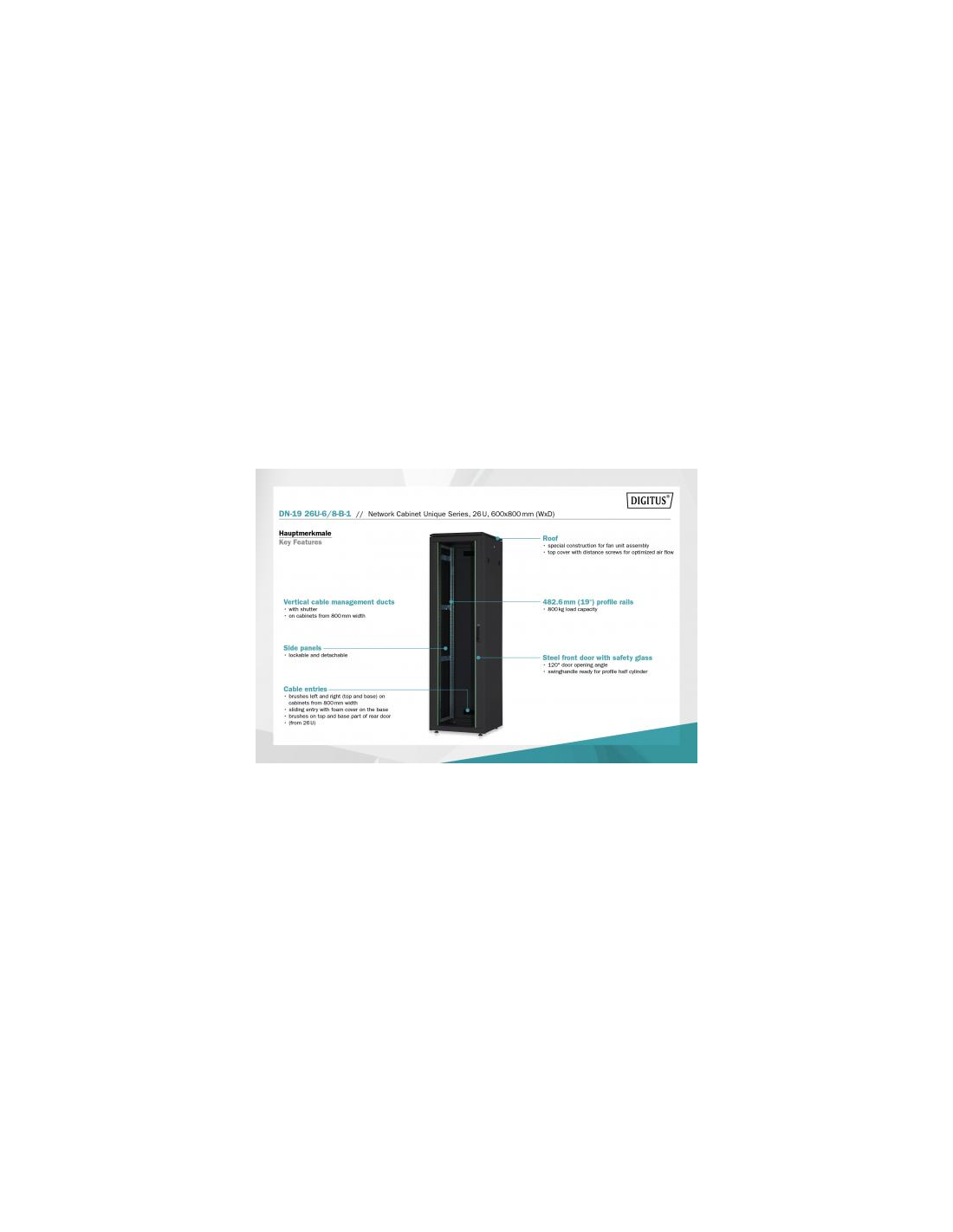 - Los armarios de red de la serie DIGITUS Unique están disponibles en diferentes alturas (22-47 UA), anchuras (60/80 cm) y profundidades (60-120 cm) - Se entregan montados encima de un palet