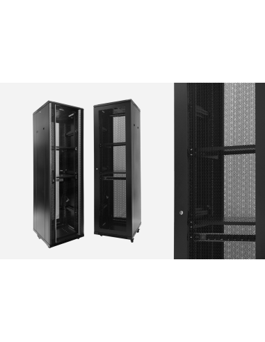 Los armarios rack de suelo de 19" de Monolyth son perfectos para albergar cualquier tipo de sistema electrónico gracias a su disponibilidad de espacio y gran capacidad de almacenaje. Las instalaciones más voluminosas no serán un problema para este tipo de armarios, además está disponible en medidas estándar de ancho, fondo y alto para adaptarse a la mayoría de espacios y tipo de instalaciones. Para este tipo de armario, tenemos disponibles 3 opciones de puertas, puerta perforada, doble perforada o cristal templado.