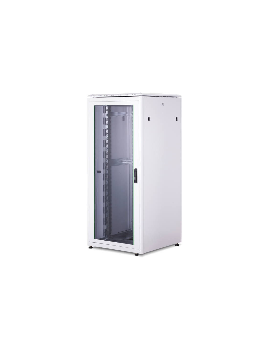 Descripción Los armarios de red de la serie Unique se han diseñado y fabricado para un cableado de red especialmente cómodo y flexible. Las sofisticadas optimizaciones ofrecen una estabilidad acorde con el mercado con la máxima flexibilidad. Un chasis base modular, que puede abrirse mediante paneles ciegos atornillados de 483 mm (19"), ofrece espacio suficiente para cables de todo tipo. Además, hay entradas de cables laterales con escobillas en la parte superior e inferior del armario, así como otra en la parte trasera del chasis base. Las regletas de escobillas traseras por encima y por debajo de la puerta trasera (a partir de 26U) permiten su uso en una amplia gama de escenarios de aplicación. Los amplios conductos de cables verticales con ayudas para el guiado de cables y tapa, instalados en la parte delantera (a partir de 800 mm de ancho de armario), completan a la perfección las versátiles características del armario de red. En el interior hay instalados dos pares de carriles de perfil de 483 mm (19") galvanizados y con manivela, etiquetados con unidades de altura que pueden leerse en direcciones opuestas. Se pueden ajustar de forma continua y están conectados a puntales de profundidad adicionales en el armario. Cada armario es una robusta construcción de chapa de acero de hasta 1,5 mm de grosor. La coloración se realiza mediante recubrimiento electrostático en polvo en los colores estándar gris (RAL 7035) y negro (RAL 9005). Los paneles laterales y las puertas modulares bloqueables y desmontables mejoran la accesibilidad. Las bisagras de las puertas pueden cambiarse. Además, los armarios pueden desmontarse completamente en caso necesario gracias a su diseño desmontable. Datos técnicos Grado de protección IP20 Puerta delantera totalmente de marco de acero con cristal de seguridad certificado, de una sola pieza Manilla giratoria con cerradura semicilíndrica de perfil incl. llave tipo 333 en la puerta delantera Puerta trasera de acero con cerradura redonda incl. llave tipo 333, de dos hojas Cierre de 1 punto en todas las puertas Paneles laterales desmontables con cerradura de guillotina tipo 333 y cierre a presión adicional Incl. 4 pies niveladores M10, cerrados Rieles de perfil de 483 mm (19") montados en la parte delantera y trasera dentro del armario, ajustables sin escalonamiento Los raíles de perfil de 483 mm (19") están galvanizados y numerados en sentido contrario a las unidades de altura Los raíles de perfil de 483 mm (19") están conectados a puntales de profundidad para aumentar la estabilidad Gran capacidad de carga de los raíles perfilados de 483 mm (19") de hasta 1200 kg Profundidad de montaje de los componentes mín.-máx.: 563 - 743 mm Conductos de cables verticales con ayudas para el paso de cables y panel de cubierta instalado en el panel frontal Chasis base modular y abrible con paneles ciegos extraíbles de 19" (450 x 537 mm) Entradas de cables en la base: 400 x 170 mm (trasera), 90 x 550 mm (lateral) Entradas de cables en el techo: 90 x 550 mm (laterales) El techo está preparado para alojar un ventilador y una cubierta desmontable. Puntos de puesta a tierra en la caja y en las puertas/paredes desmontables Listo para su uso inmediato: La entrega se realiza montada (el armario se puede desmontar completamente si es necesario) Atributos Ancho: 800 mm Capacidad de carga: 1200 kg Color: gris claro, RAL 7035 Paneles laterales: Ambos lados Profundidad: 800 mm Puerta delantera: Puerta de cristal, apertura simple Puerta posterior: Puerta de acero, cerrada, apertura doble Tipo de armario: Armario de red Unidades: 36 Clase de protección IP: IP20 Montado: sí Contenido del paquete Juego de cables de puesta a tierra Juego de instalación (tornillos, tuercas enjauladas, arandelas) 2 x llave 4 x pie nivelador, M10