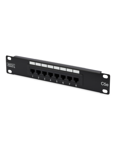 DIGITUS CAT 5e, panel de conexión clase D, sin apantallar Número de artículo: DN-91508U EAN: 4016032241430 Panel de conexión CAT 5e, no apantallado, 8 puertos RJ45, 8P8C IDC, 1UE, 254 mm (10"), montaje en rack, negro Optimiza el rendimiento y la calidad de las conexiones de su red. Instalación de cables sencilla opcional a través de tiras LSA con códigos de colores Diseño compacto de 10" con 8 tomas hembra RJ45 Especificaciones de conformidad con la norma ISO/IEC 11801 y EN 50173