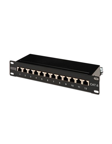 Digitus CAT 6, Clase E Patch Panel, blindado, 12 puertos RJ45, 8P8C, LSA, 1U, 254mm (10 ") para montaje en rack, color negro RAL 9005