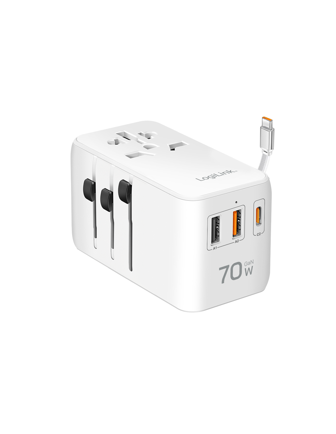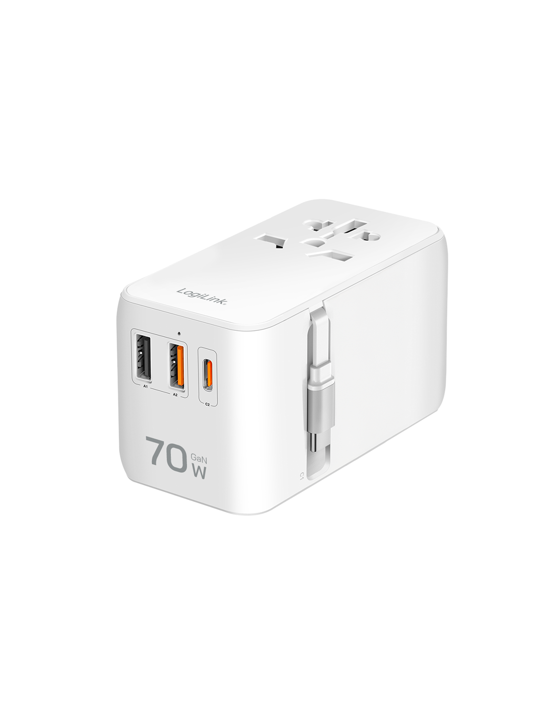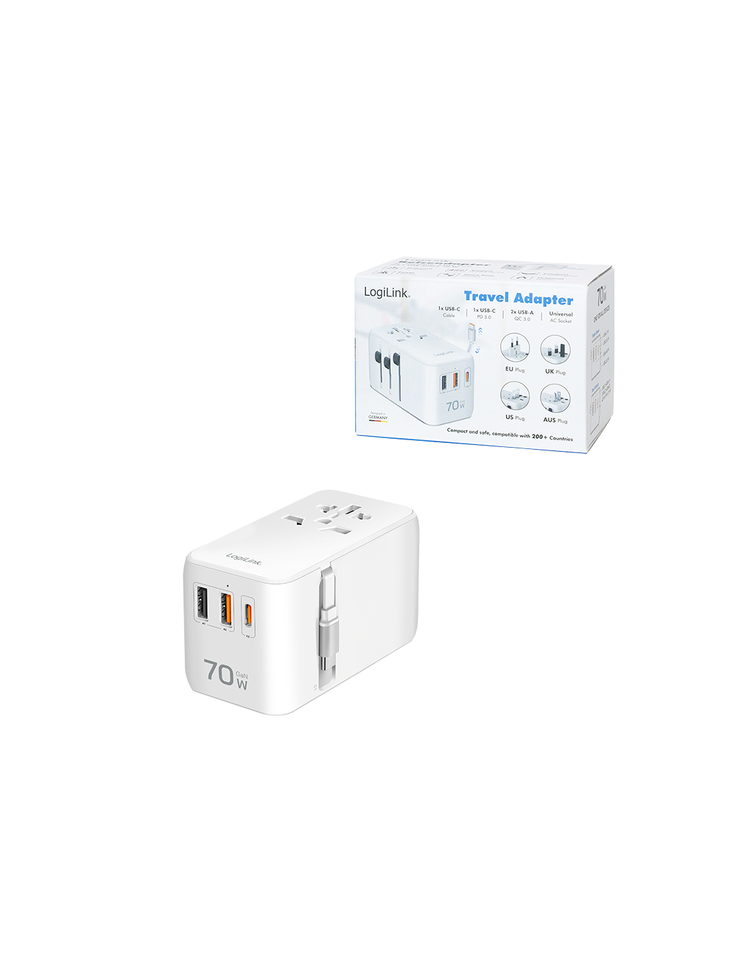 Cargador de viaje universal, 70 W (PD), 4 conexiones,Cable, ignífuga, (EU/UK/US/AUS) Blanco Logilink