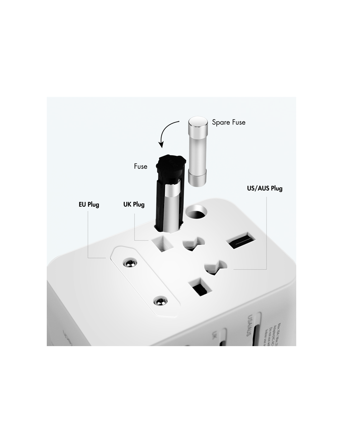 - Adaptador de viaje universal fabricado en material ignífugo y con fusible incorporado de 10 A y fusible de repuesto.