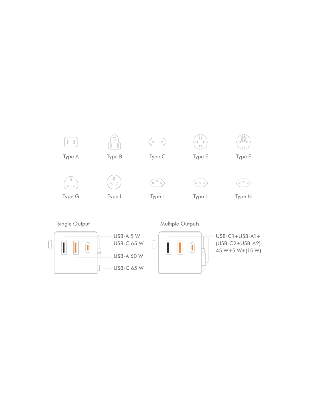 - Salida USB: USB-C1/C2: (65 W máx.), USB-A1: (60 W máx.), PPS: (55 W máx.), C1+C2: (20 W máx.), salida total: 70 W