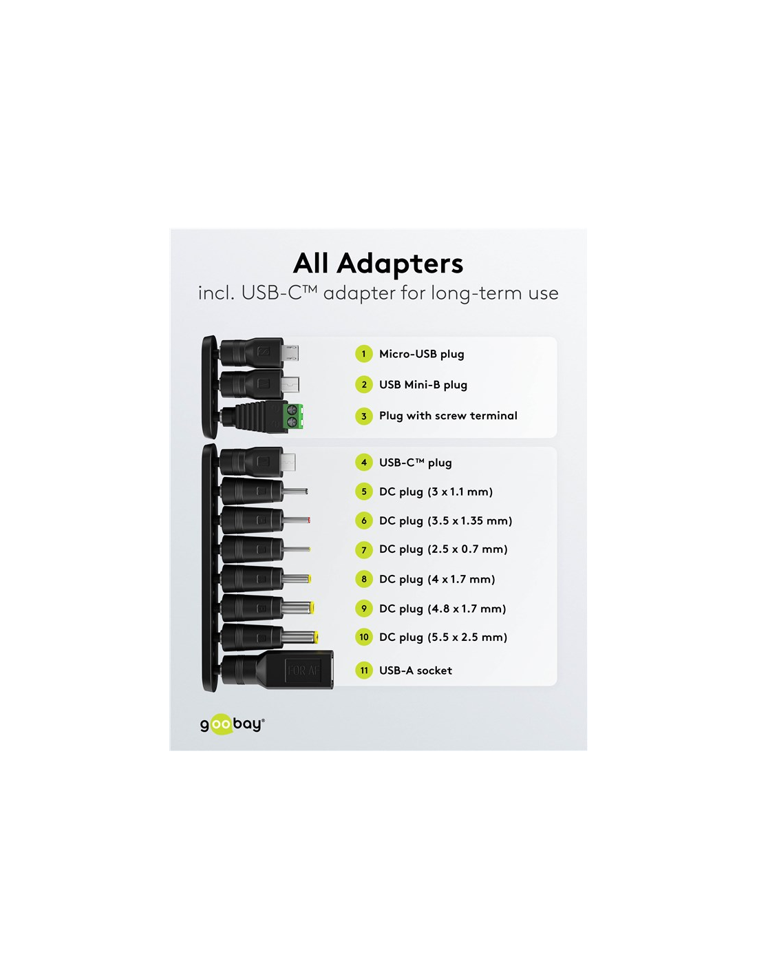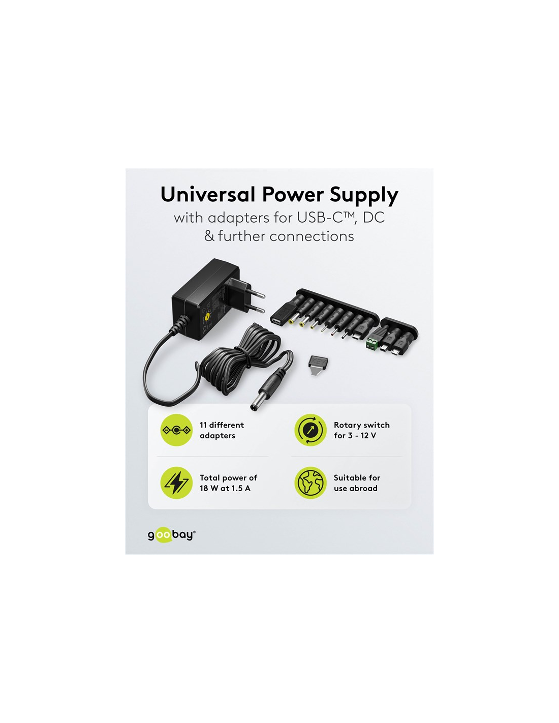 Alimentador Universal 3-12V 18W 1,5A 7 Conectores DC y USB-A, USB Mini-B, Micro-USB Goobay