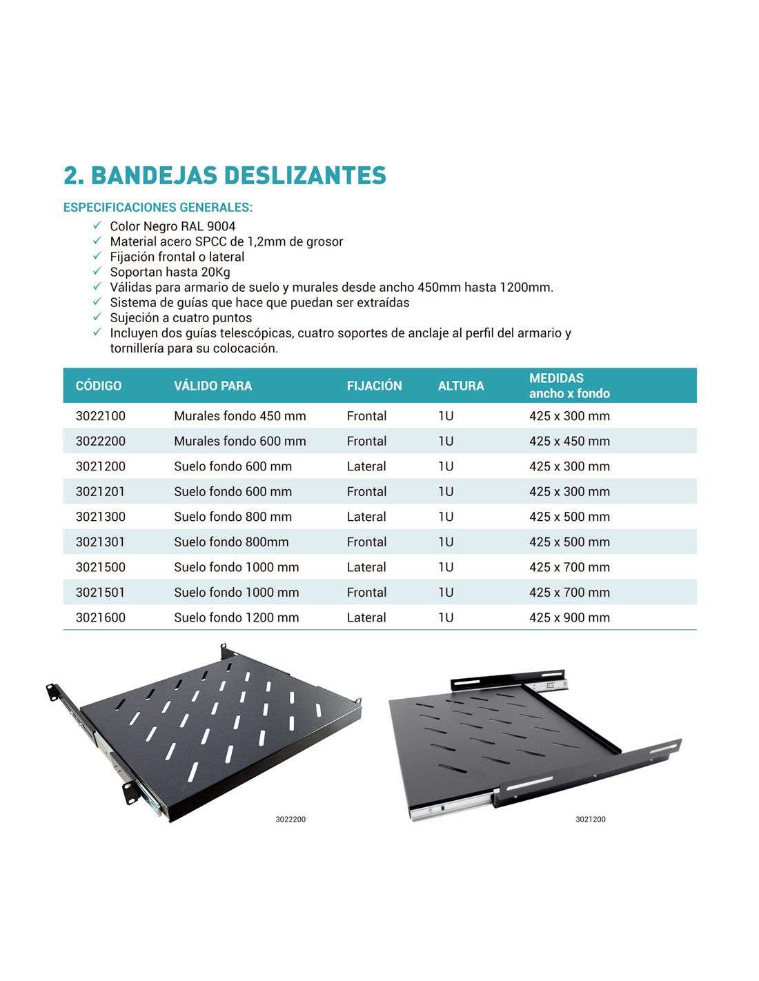 Bandeja Fija Adaptable 1U para rack 1000-1200 Monolyth. Dimensiones: Altura: 45 mm. Profundidad: 400* mm. Ancho: 485 mm. La bandeja fija de fondo adaptable se alarga hasta los 700mm de fondo