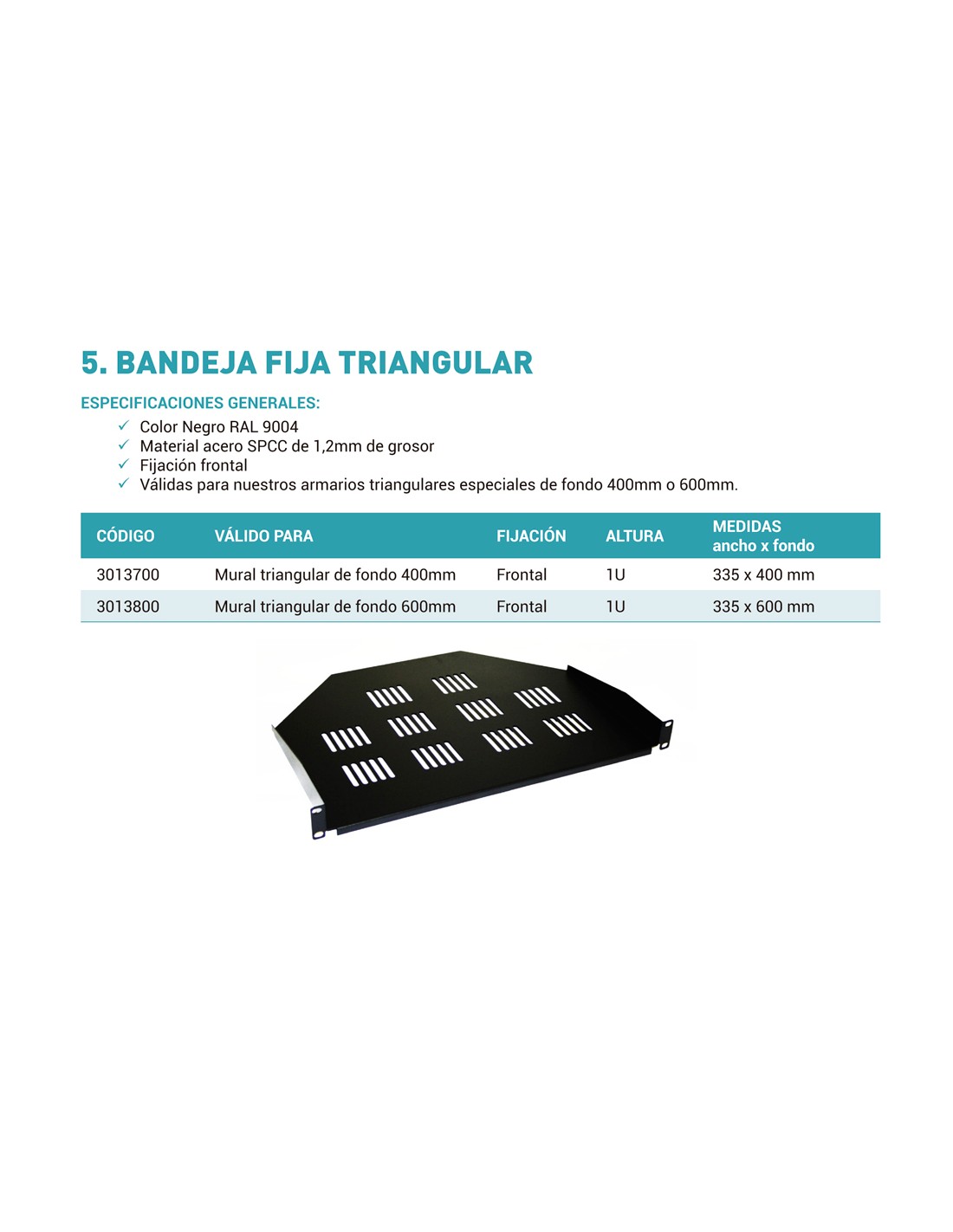 3032000 MONOLYTH - BANDEJA FIJA ADAPTABLE FONDO 450-600. Bandejas adaptables, accesorios muy versátiles para armarios de 19" que oscilan entre diferentes medidas con fondos para armario estándar para facilitar su instalación. Disponibles en diferentes alturas U y en modelo para armario mural. Colocación frontal fija. Están fabricadas en acero SPCC de 1,2...