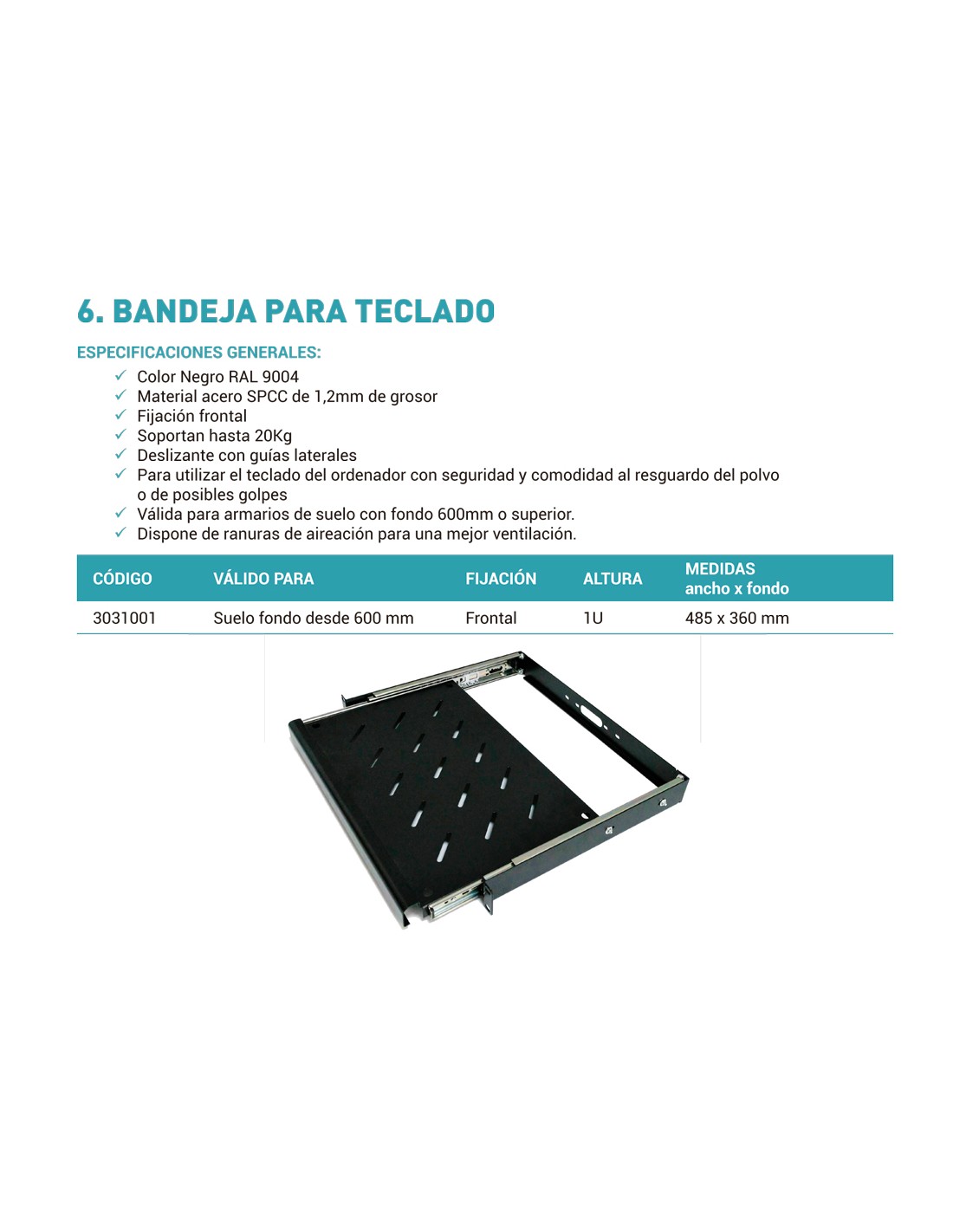 Bandeja de fijación frontal, deslizante con guías laterales que permiten un cómodo y suave desplazamiento. Pensadas para utilizar el teclado del ordenador con seguridad y comodidad al resguardo del polvo o de posibles golpes. Válida para armarios de suelo con fondo 600mm o superior. Fabricada en acero SPCC de 1.2 mm. de grosor, de color negro y dispone de ranuras de aireación para una mejor ventilación.