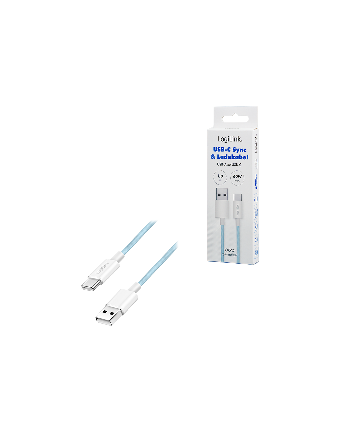 CU0322 Cable de 1,50m USB 2.0 0.48 Gbit/s PD60W USB C Macho a USB-A Macho Blanco NYLON Logilink Retail