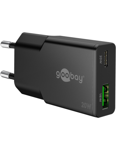 Cargador rápido dual USB-C PD GaN Slim (20 W) negro 1 puerto USB-C (Power Delivery) y 1 puerto USB-A (Quick Charge) Con la serie Slim, Goobay ofrece un diseño de cargador ultraplano. Especialmente diseñado para las necesidades de los viajeros, este adaptador de corriente USB delgado cabe en cualquier bolso o maleta. La solución de alimentación perfecta para smartphones, tablets o smartwatches, tanto en movimiento como de viaje. Con 20 W de potencia, el conector USB está especialmente diseñado para dispositivos pequeños como smartphones, auriculares Bluetooth, tablets o baterías externas. Con su diseño compacto y minimalista, el cargador USB-C cabe fácilmente en cualquier bolso y es el compañero perfecto para viajar.