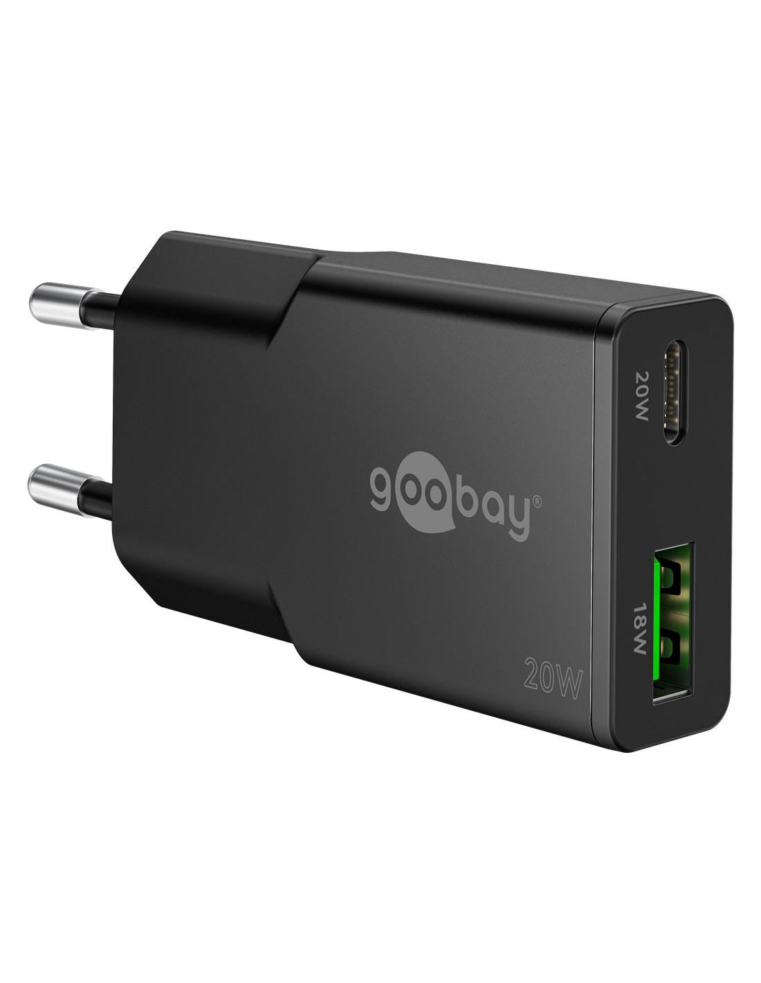 Cargador 20W USB 2 puert. USB-C PD x , USB-A QC 1 GaN Dual Fast Charger Slim Negro Goobay