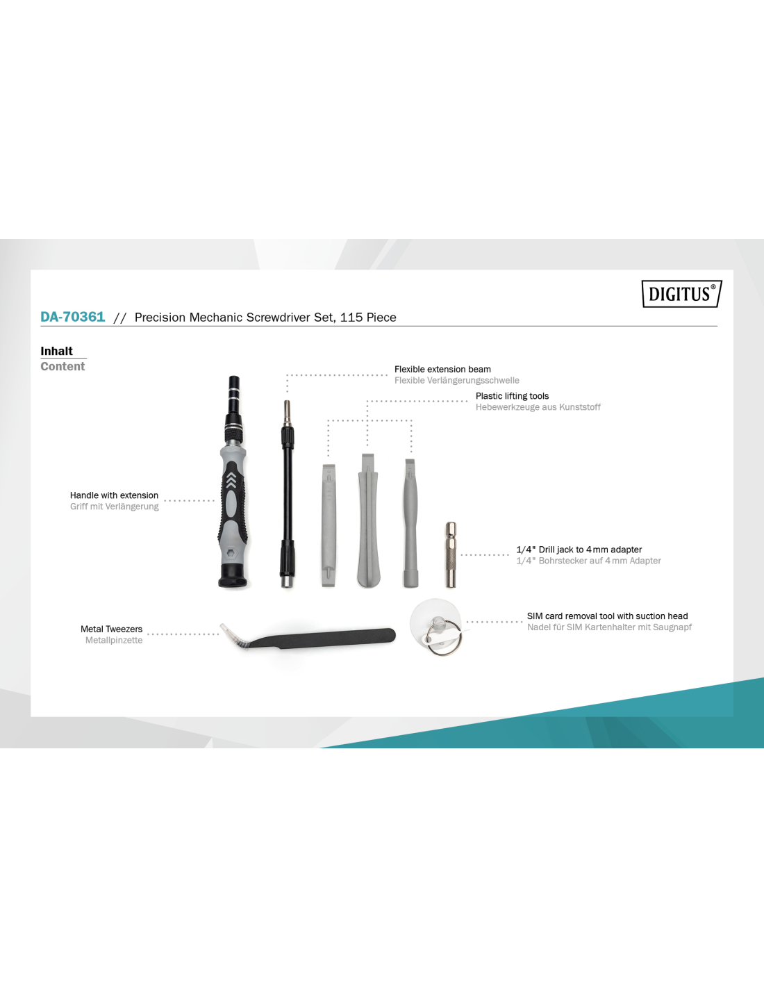 El juego de herramientas DIGITUS contiene una amplia selección de puntas de destornillador, guardadas en una caja manejable, fácil de transportar y rápidamente preparada para el uso. Las puntas de destornillador están fabricadas de acero para herramientas S2 de alta calidad, por lo cual son robustas y duraderas. Siempre está disponible la punta de destornillador adecuada, especialmente para la reparación de smartphones, la instalación de accesorios de ordenador o el modelismo.
