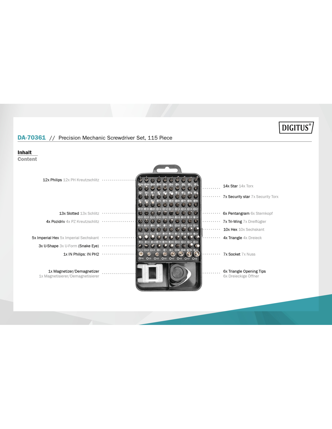 - 115 piezas para diversas aplicaciones de mecánica de precisión. Con la caja equipada en ambos lados, el juego es compacto y ordenado a la vez.