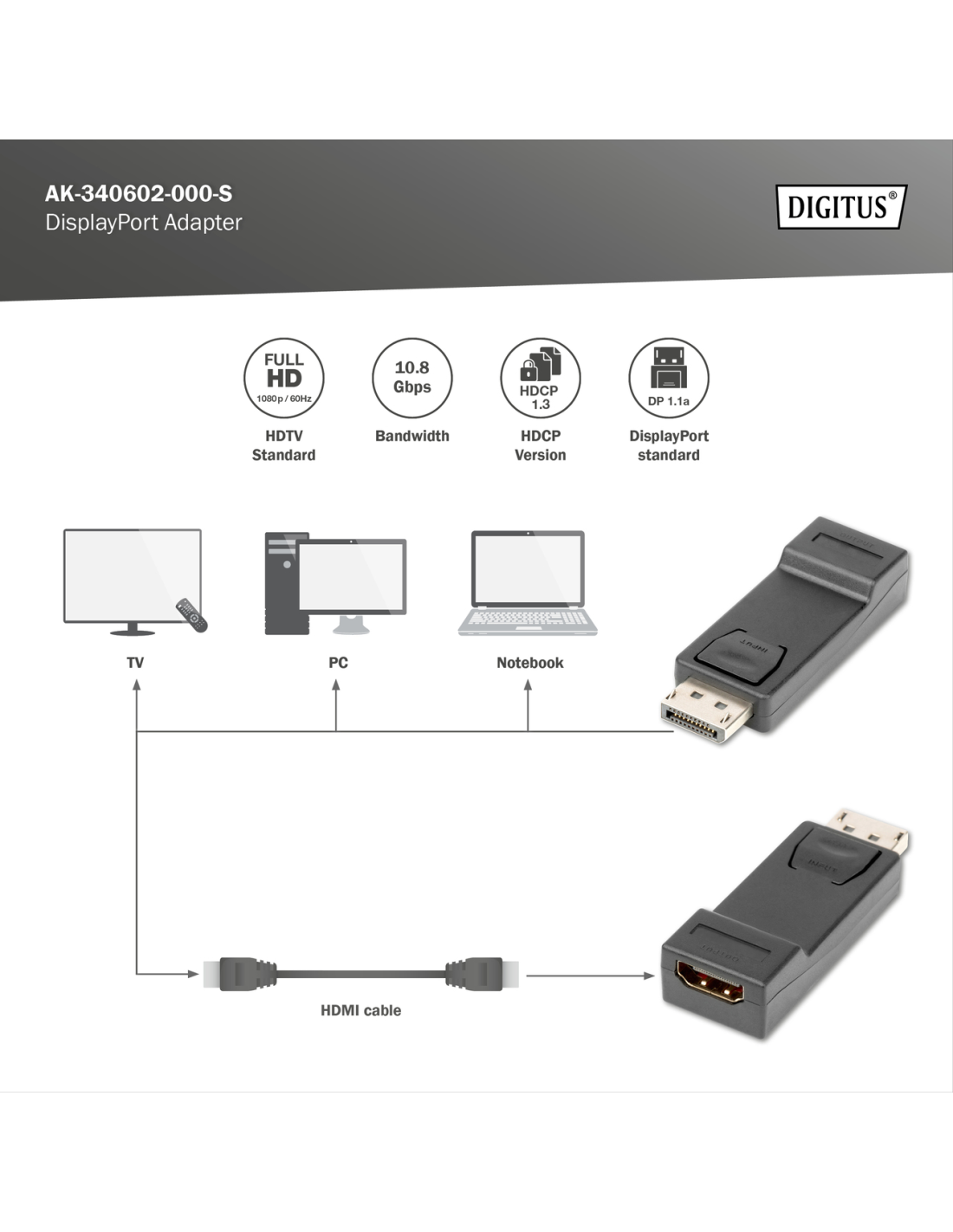 Adaptador Displayport 1.1a Macho a HDMI Hembra Compacto Digitus