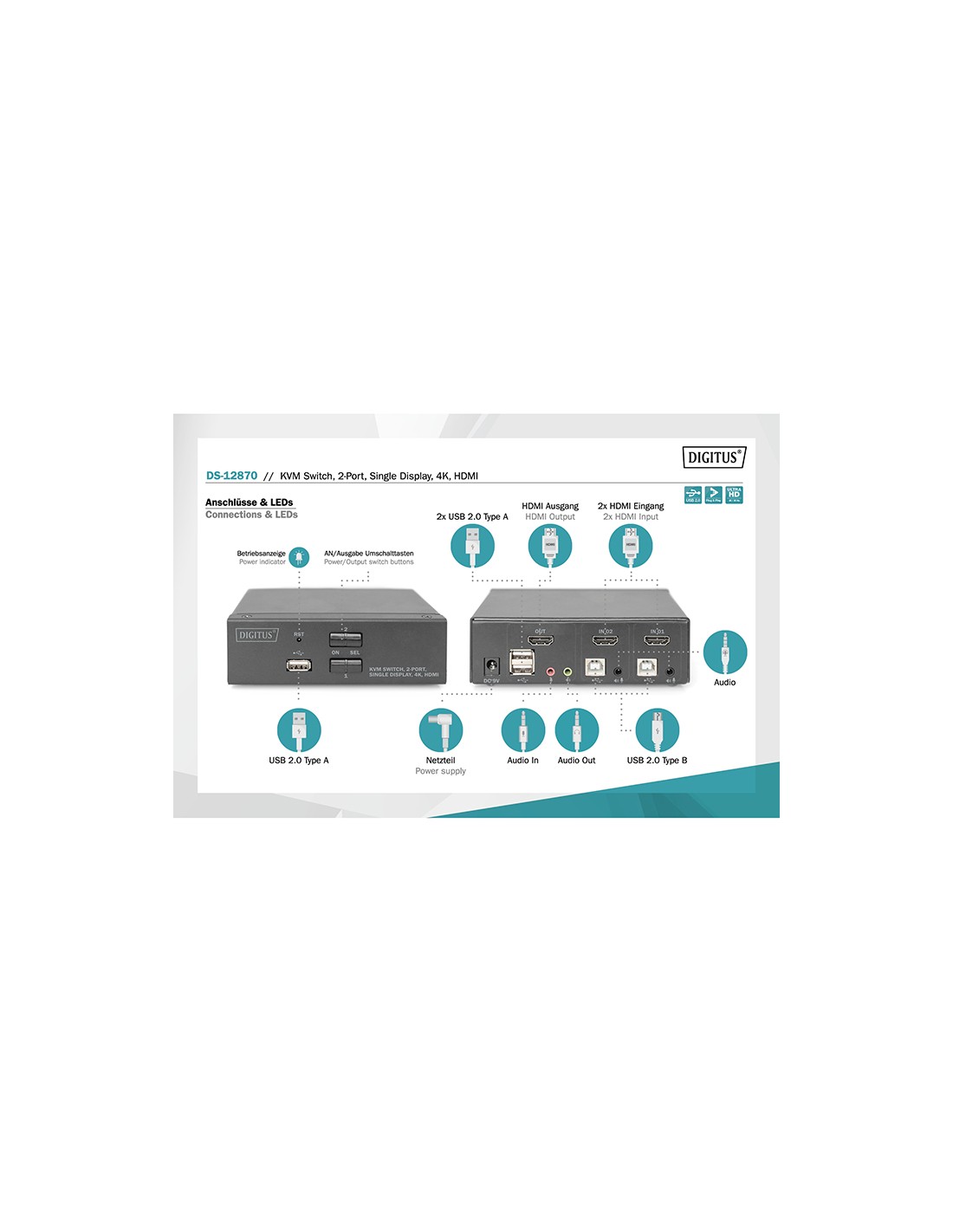 - DIGITUS Conmutador KVM, 2 puertos, pantalla simple, 4K, HDMI®