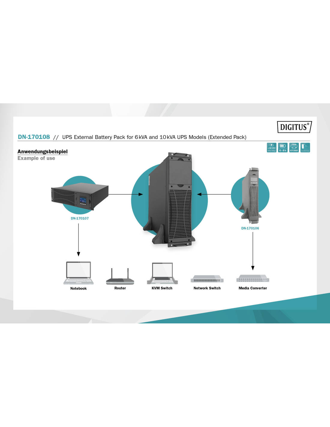 Los módulos de batería SAI DIGITUS® se encargan de que los dispositivos SAI utilizados en entornos altamente exigentes mantengan la alimentación eléctrica segura a los equipos conectados en caso de interrupciones del suministro de energía. Es posible conectar un máximo de 4 módulos de batería para alargar el tiempo de funcionamiento de los equipos informáticos conectados. Durante el cambio de batería queda asegurado que los sistemas permanezcan protegidos a través de la alimentación eléctrica ininterrumpida. Si se incrementa la demanda, las baterías externas pueden asegurar un aumento rápido del tiempo de reserva.