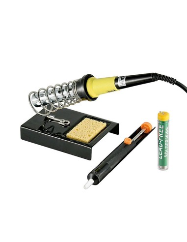 Set de soldadura sin plomo de 4 piezas, 30 W Con soldador, soporte, bomba desoldadora y estaño Este set de soldador para aficionados proporciona el equipo básico para todo tipo de trabajos de soldadura, como PCB, SMD, DIP y electrodomésticos. La solución compacta y sencilla para cualquier manitas. Soldador con cable y punta de lápiz para pequeñas reparaciones y soldadura sin plomo en placas de circuito, electrodomésticos y aparatos eléctricos. Ideal para trabajos de precisión en modelismo o pirograbado. Soldador con un consumo máximo de 30 W y una temperatura máxima de 450 °C. Soporte robusto para guardar el soldador de forma segura una vez caliente, incluye una esponja para limpiar la punta. Succionador de estaño con punta recubierta de teflón para eliminar estaño, fundente y otros residuos. 10 g de estaño: sin plomo, sin fundente, 99,3 % estaño, 0,7 % cobre.
