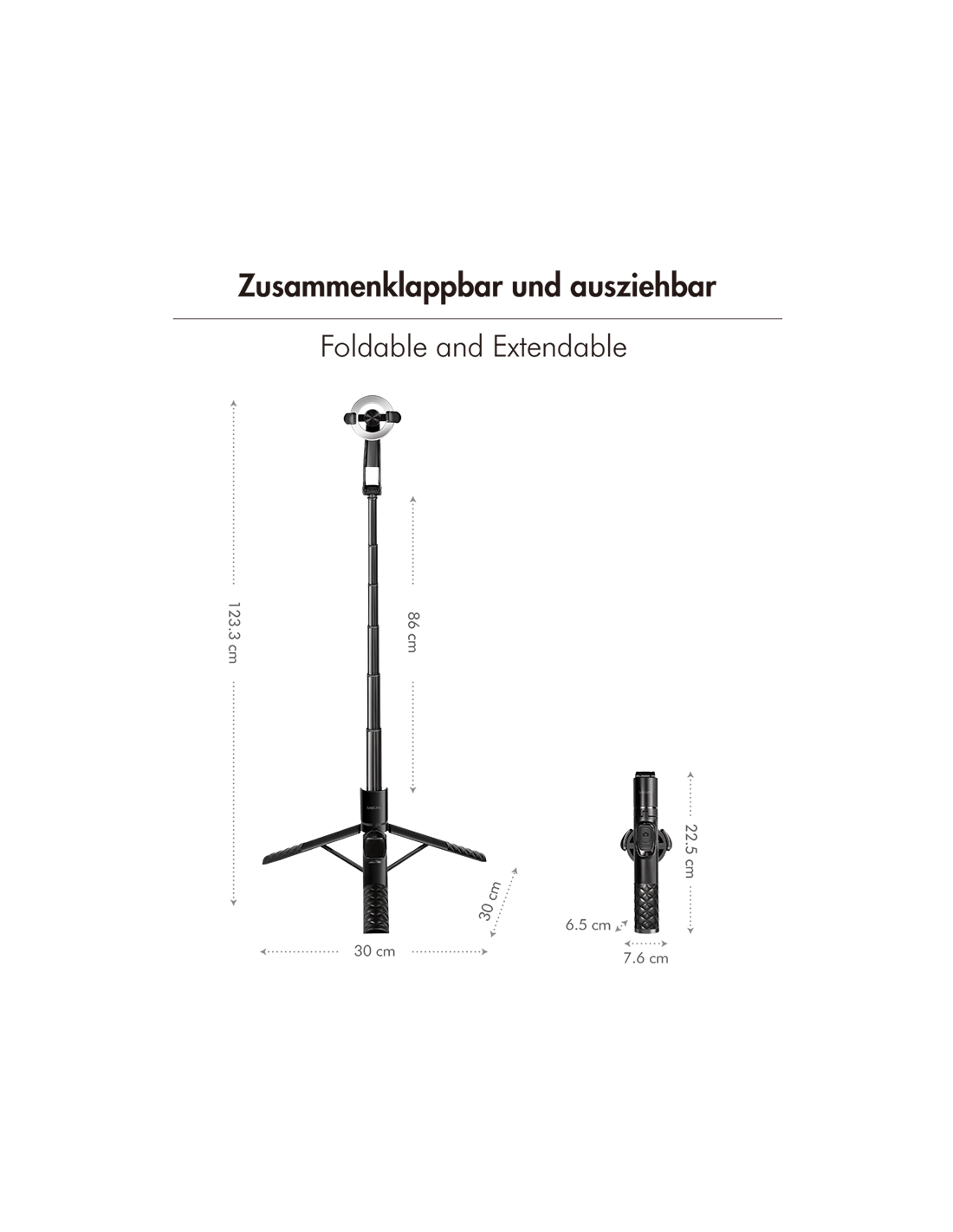 - Dimensiones: 22,5 x 6,5 x 7,6 cm (plegado), 123,3 x 30 x 30 cm (estirado)